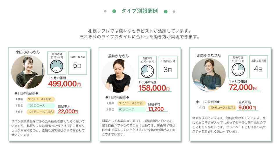 施術件数 / 指名獲得率 / リピーター獲得数に応じて報酬率がアップしていく仕組みになっているので頑張り次第でしっかり稼げる環境となっております。