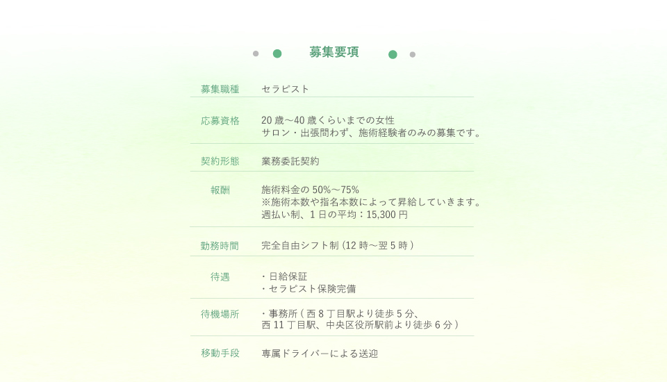また新入店のセラピストの皆様には、入店から 3 ヵ月間は優先的にご予約の割り振りを行いますので安心してご入店ください。